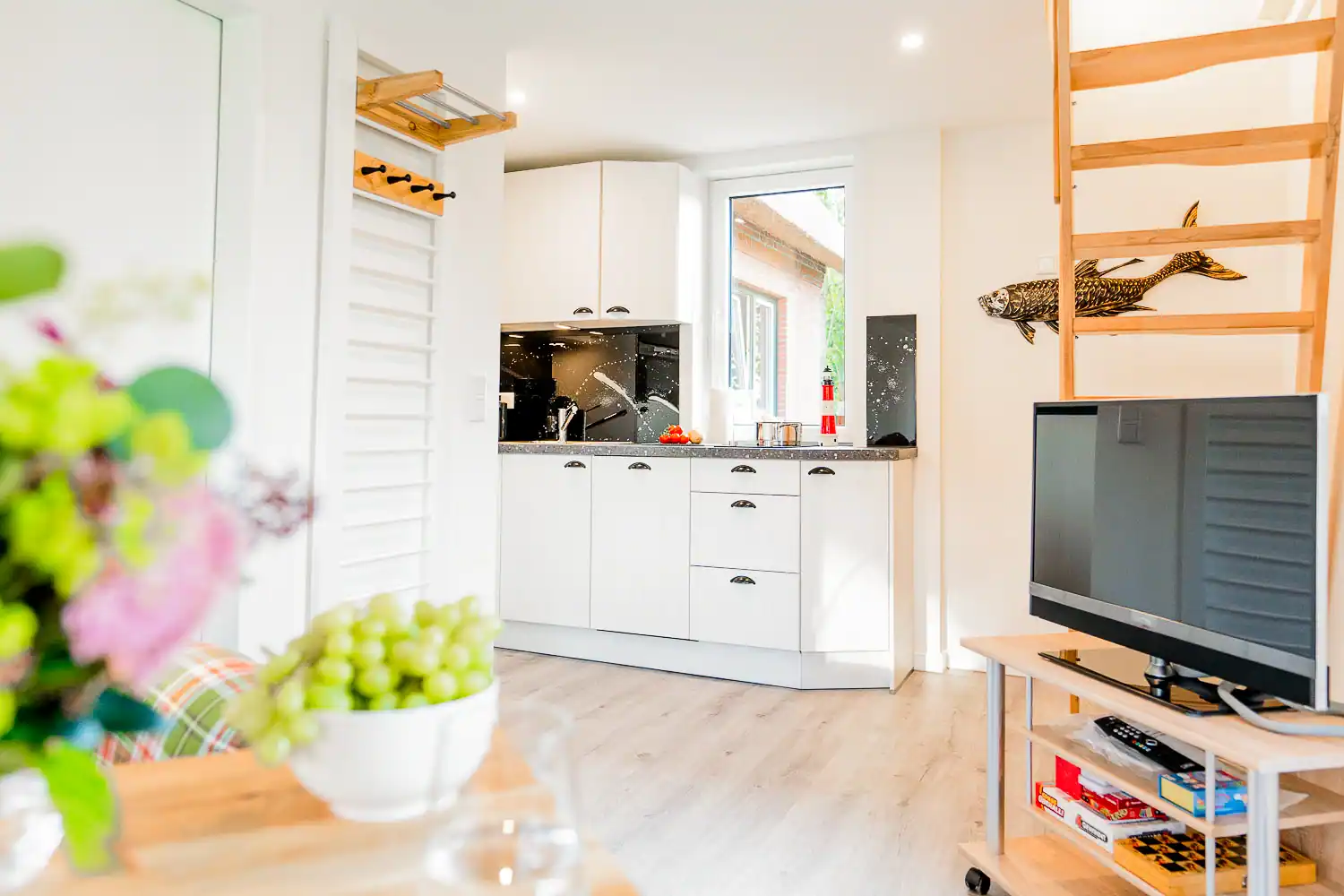Jede unserer Ferienwohnungen verfügt über eine eigene Terrasse, eine voll ausgestattete Küche mit Geschirrspüler, Backofen, Kühlschrank, Kaffeemaschine und Wasserkocher sowie ein modernes Bad mit Haartrockner. Auch WLAN und ein Parkplatz stehen dir kostenlos zur Verfügung. Für gemütliche Stunden gibt es Bücher und Spiele in jeder Wohnung.